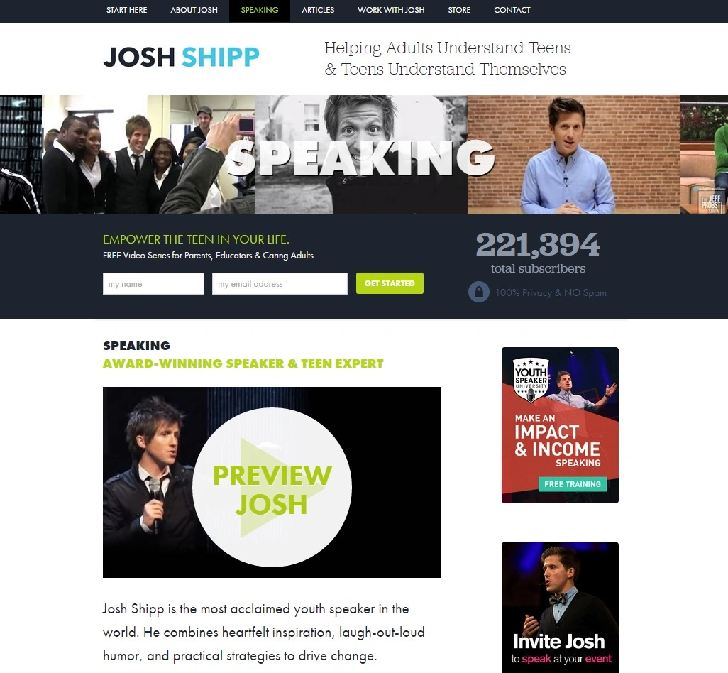 这里有一个Josh Shipp的演讲页面示例——他是一位知名的青少年专家、电视主持人和作家: