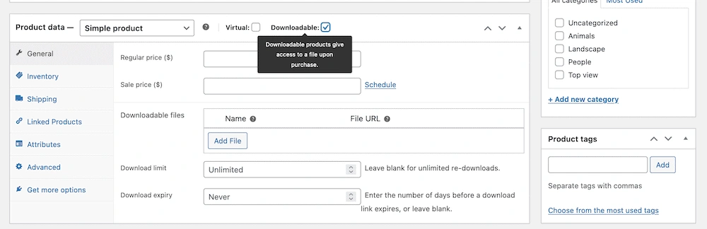接下来,向下滚动到产品数据元框。这是您设置产品技术细节的地方,例如价格、库存状态和属性。但是,对于从 Gumroad 转换过来的大多数用户,您需要勾选可下载复选框,这会显示更多选项。