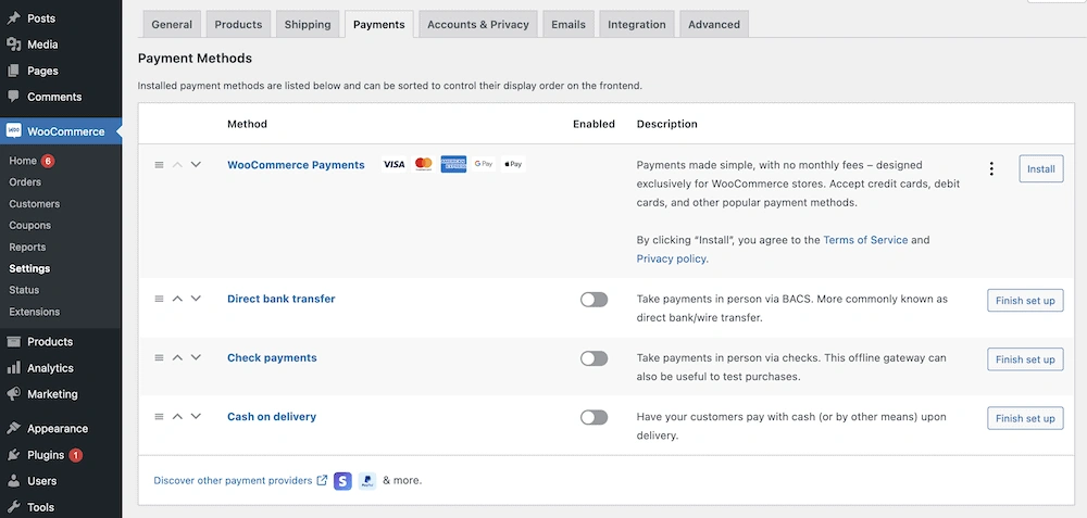 默认情况下,WooCommerce 让您使用开关实现货到付款、支票付款和直接银行转账。每种方式都有自己的设置,完成起来很直观。但是,您也可以安装 WooCommerce Payments 扩展。这让您可以接受信用卡、Google Pay 和 Apple Pay 付款。