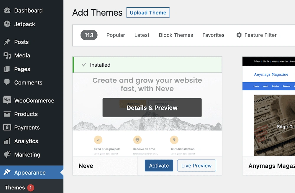 下一步是「激活」主题,只需点击「激活」按钮即可。完成后,请预览您的网站,看看新主题的效果如何!