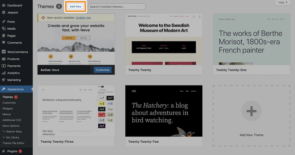 虽然您可以陷入设计迷宫,但正确的主题可以完成大量繁重的工作。要安装一个主题,请在 WordPress 中的 外观** > **主题 屏幕中,点击该页面顶部的添加新按钮: