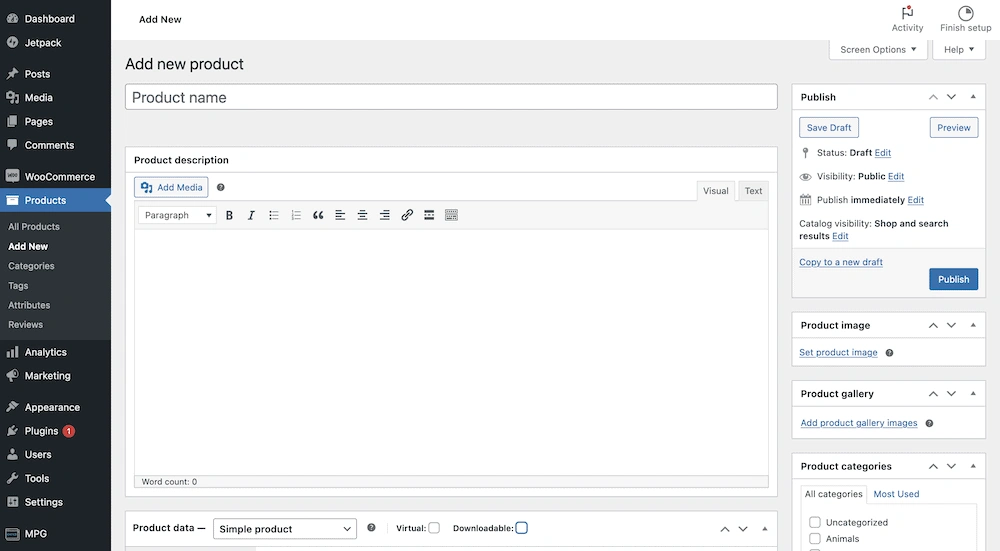 此时,你可以设置新产品。为此,请进入WordPress中的 产品** > **添加新 页面: