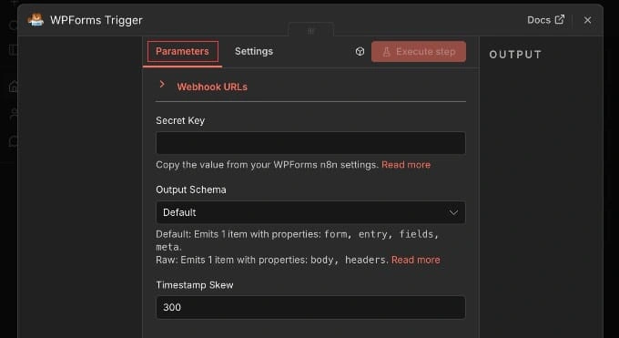 切换回您的n8n浏览器选项卡,工作流程仍然打开。在WPForms触发器节点设置中找到"密钥密钥"字段,然后粘贴您刚从WPForms复制的密钥。