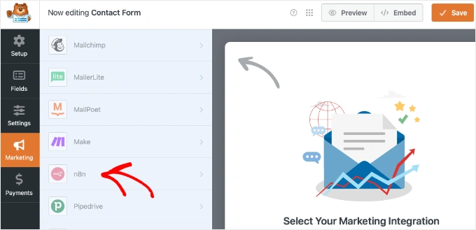 进入表单构建器后,在左侧边栏中导航到营销 » n8n。