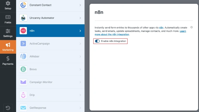第一步:在 WPForms 中激活 n8n 集成