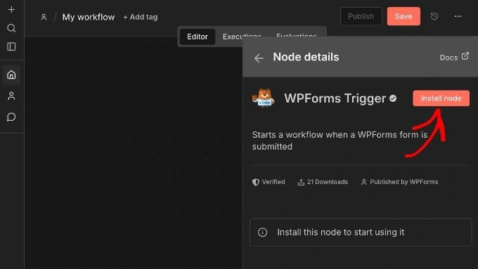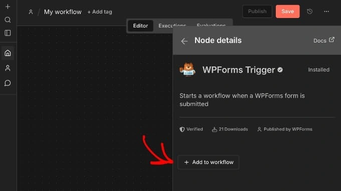安装完成后,点击"添加到工作流程"将 WPForms 触发器节点插入您的工作流程。