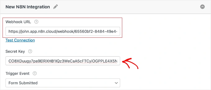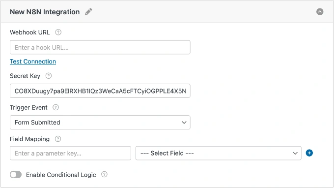 您的 n8n 工作流程已准备好接收数据,现在是时候将其连接到您的 WordPress 表单了。此步骤将您的表单提交直接链接到您的自动化工作流程。