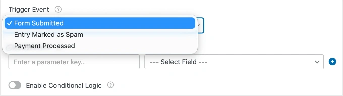 回到WPForms,查看"触发事件"下拉菜单。此设置决定何时数据被发送到n8n。
