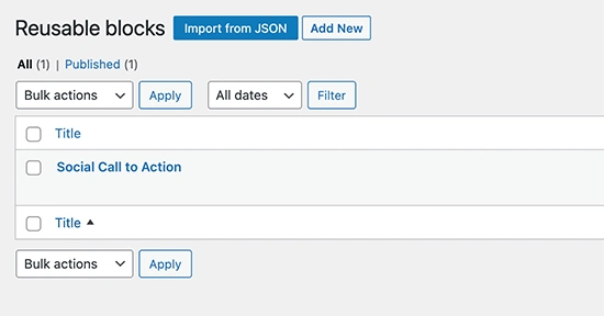 这将带您进入区块管理器页面。在这里,您可以编辑或删除任何可重复使用的块。您还可以导出可重复使用块,并将它们用于任何其他 WordPress 网站。