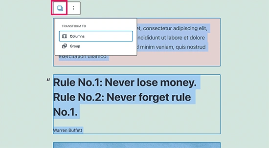 然后,点击工具栏上的块类型按钮,将选定的块转换为组或列。