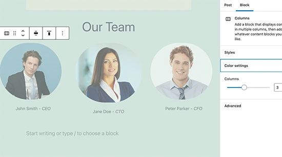 有了块编辑器,您只需添加一个表格块,选择列和行,然后就可以开始添加内容了。