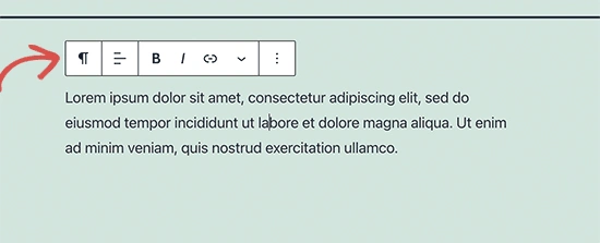 例如,在这张截图中,我们在一个段落块中工作,该块显示了基本的格式按钮,如文本对齐、粗体、斜体、插入链接等。