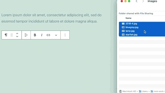 你可以拖放单个图片或视频文件,它就会为你创建块。您还可以拖放多个图片文件来创建一个图库区块。
