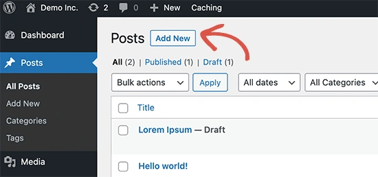 你可以像平常一样开始创建新文章或页面。只需点击 WordPress 管理中的 "文章" "添加新内容 "菜单。如果是创建页面,则进入页面添加新内容菜单。
