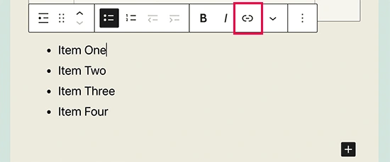 块编辑器有几个可以添加文本的区块。最常用的是段落块,它在工具栏中带有插入链接按钮。 所有其他常用文本块的工具栏上也都有一个链接按钮。