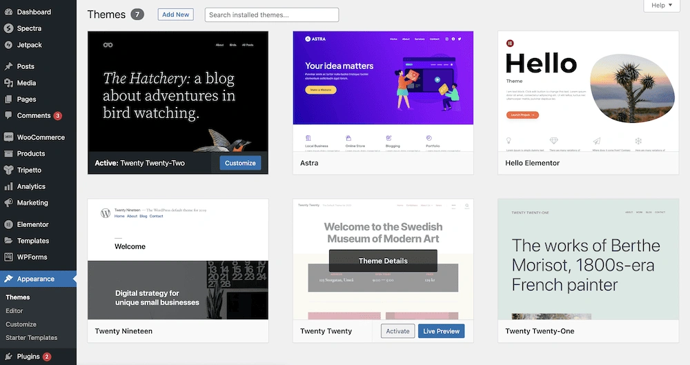 你可以执行相同的基本程序来排除主题故障,因为它们可能像插件一样导致冲突。但是,我们建议你采取一个额外的步骤来减少你的潜在工作量:首先从 外观** > **主题 屏幕切换到默认主题(如 Twenty Twenty-Two 或 Twenty Twenty)。