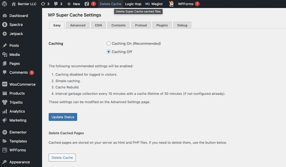 缓存插件是几乎每个网站都会安装以提升性能的插件。每个缓存插件清除缓存的方式都不同。通常,这个选项会在你的设置中或WordPress工具栏上可见。例如,WP Super Cache在仪表板的任何位置都为你提供了一个“删除缓存”的清除按钮。