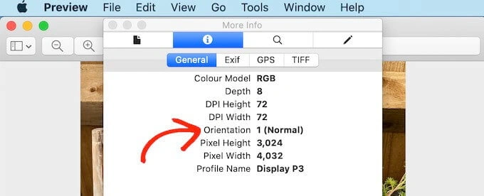 许多软件编辑程序让你检查图像的元数据。例如,你可以使用Mac预览应用程序检查图像的方向信息。