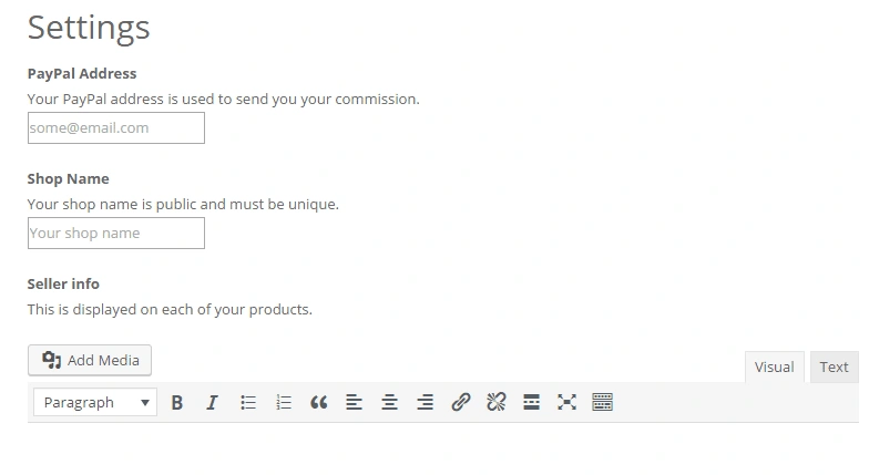 在商店设置页面,供应商可以添加他们的PayPal邮箱地址,选择商店名称,并添加描述: