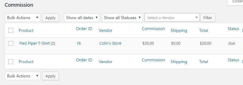 首先,进入WooCommerce → 佣金可以查看你的市场产生的所有单个佣金。你也可以按单个供应商以及佣金状态(应付、已付或已退回)进行排序:
