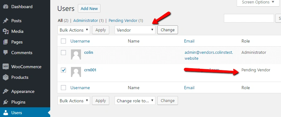 一旦你创建了模拟供应商账户,你需要切换到你的管理员账户,通过进入用户选项卡来批准该供应商账户。只需将用户角色从待定供应商更改为供应商即可: