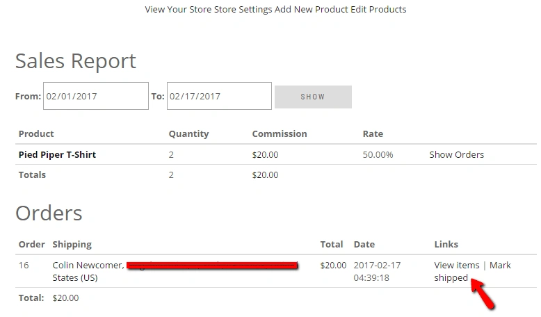 同样,你的供应商也将能够查看订单和佣金,以及将产品标记为已发货: