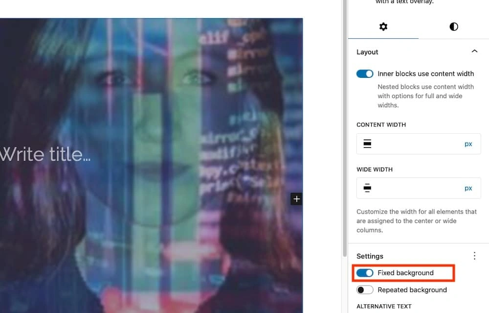 要做到这一点,插入一个 Cover 区块,设置背景,然后进入其侧边栏设置并启用 固定背景。这使得背景保持不动,而前景内容可以滚动。