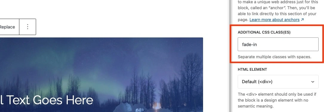 然后将fade-in类分配给你的Cover、Image或Group块。如果你更喜欢预建解决方案,也可以集成轻量级库如Animate.css,同时仍需监控性能并在不同设备上进行测试。