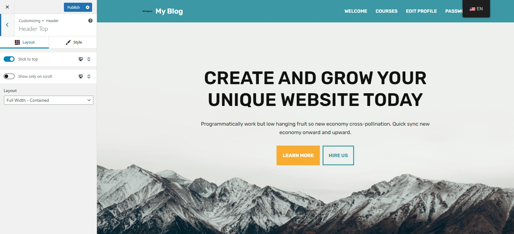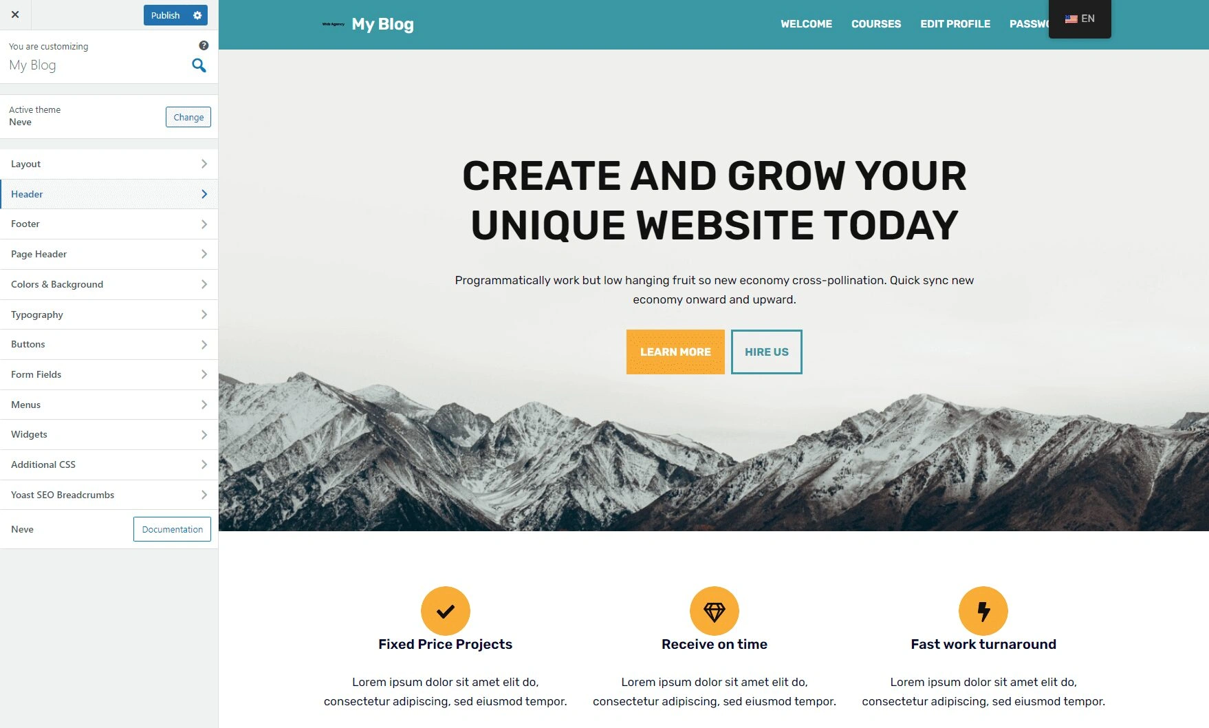 之后,点击 发布,或继续使用 Neve Pro 的内置工具和选项自定义您的头部。