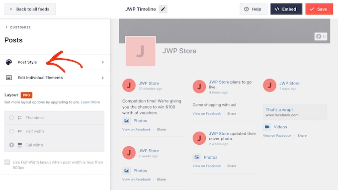 接下来,您可以通过从左侧菜单中选择“帖子样式”来更改各个帖子在您的提要中的外观。