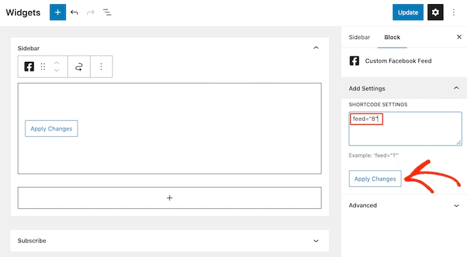 您现在可以将feed=""代码添加到此框中。完成后,单击“应用更改”按钮。