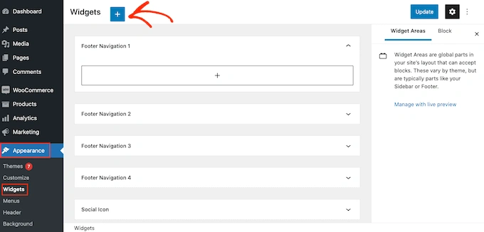 只需转到WordPress 仪表板中的外观 » 小部件,然后单击蓝色的“+”按钮。