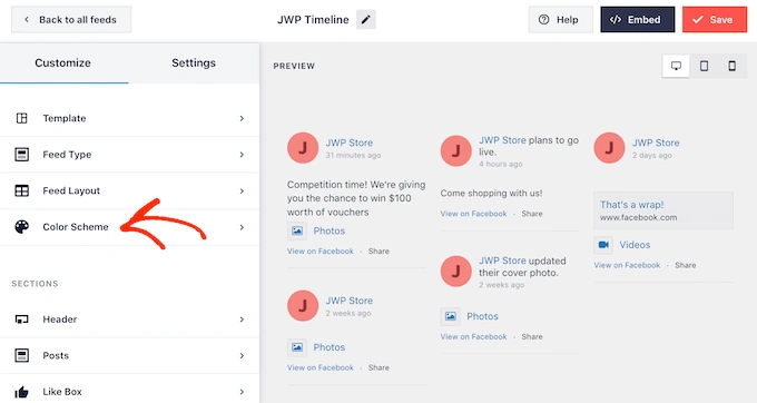 这会将您带回到 Smash Balloon 主编辑器,准备好探索下一个设置屏幕,即“配色方案”。