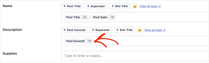 当您对标题的设置感到满意时,就可以添加描述了。 通常情况下,使用 "Excerpt "标签比较合理,这样 AIOSEO 就会使用 WordPress文章的摘录。不过,您也可以使用任何智能标签,甚至在 "Description "字段中输入纯文本。