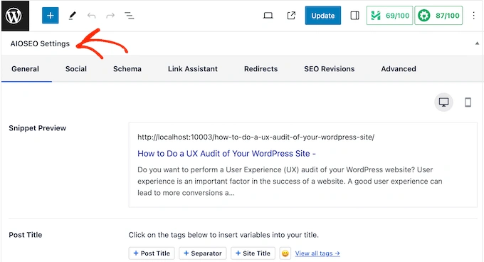 默认情况下,AIOSEO 会在 "title "字段中添加 "Post Title "智能标签。AIOSEO 会自动将所有智能标签替换为真实值,这样你就可以创建独一无二的标记,而无需手动键入所有要使用的信息。