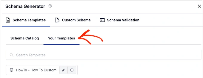 要将模板应用到内容中,只需点击 "Generate Schema"按钮,即可像往常一样打开模式目录。 然后,点击 "Your Templates "选项卡。