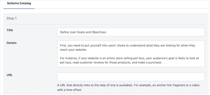 这将创建一个部分,您可以在其中添加标题和描述,以及可选的锚链接和图片。只需重复此过程,即可将所有步骤添加到 "如何 "schema中。