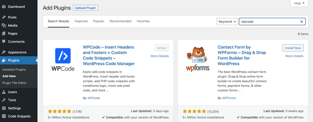 要开始使用,首先需要安装插件。这非常简单,因为 WPCode 提供了一个免费版本,您可以在 WordPress 控制面板上随时使用。只需进入插件 > 添加新插件,然后搜索 "WPCode "即可。