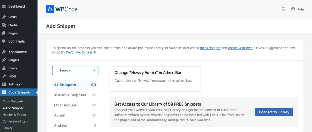 如果搜索 "howdy",就会看到库中有一个片段,用于 "自定义管理栏中的问候信息"。将鼠标悬停在要使用的片段上,点击出现的Use snippet蓝色按钮。