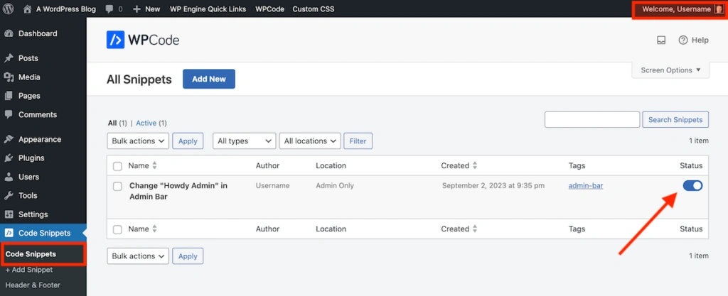 要激活你的代码片段,点击末尾一栏的切换按钮,使其处于打开状态。现在刷新或查看片段生效的页面。由于我们的片段示例编辑了管理信息,因此我们刷新页面后,可以看到右上角正确显示了 "Welcome"。