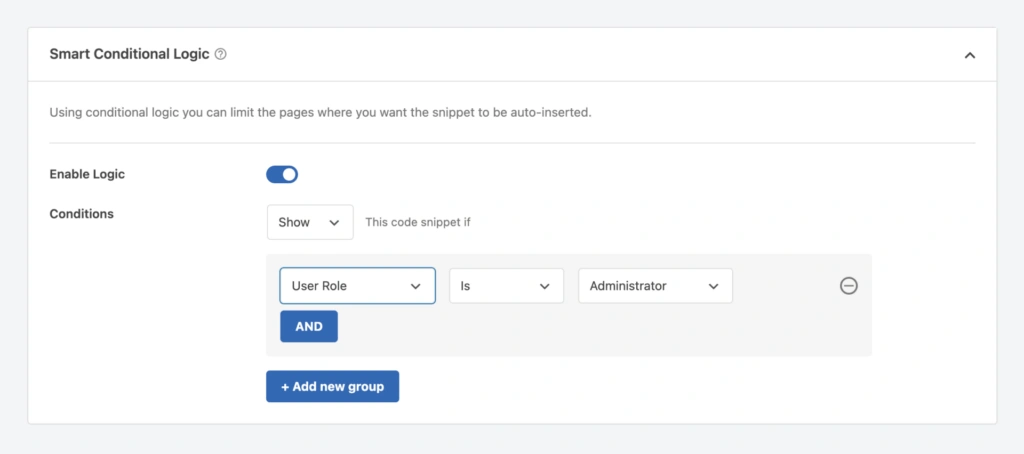 WPCode 还提供添加智能条件逻辑的选项。这样,您就可以为要加载的代码片段添加更具体的限定条件。