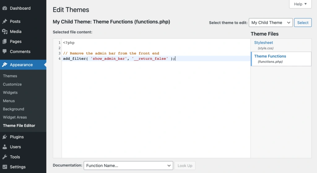 现在,您可以在代码编辑器(或 WordPress 外观 > 主题文件编辑器)中打开子主题的 functions.php 文件,然后添加您的代码段。大多数代码段都会添加到 functions.php 文件中(但也有一些例外)。