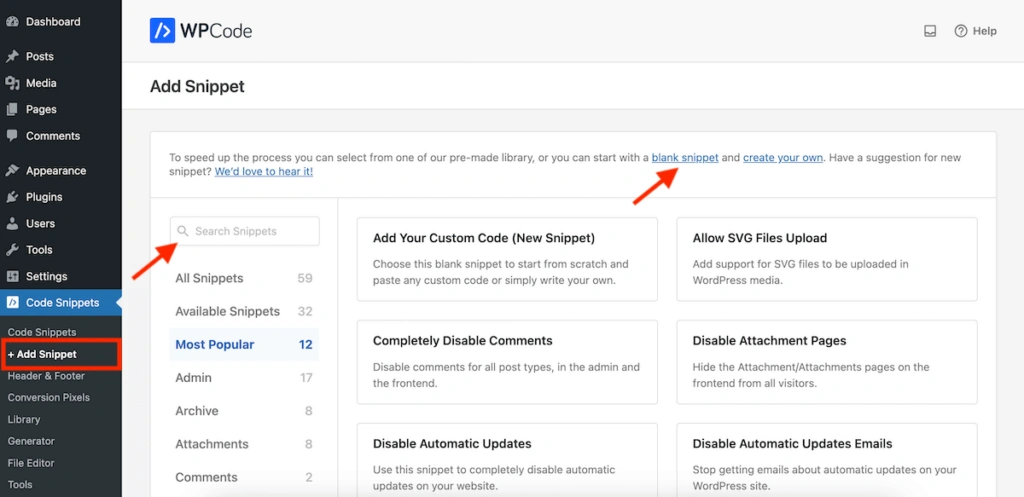 在 WordPress 面板的Code Snippets,点击 "+ 添加片段 "菜单项。这将带你进入一个屏幕,你可以从空白代码片段开始或浏览 WPCode 代码片段库。