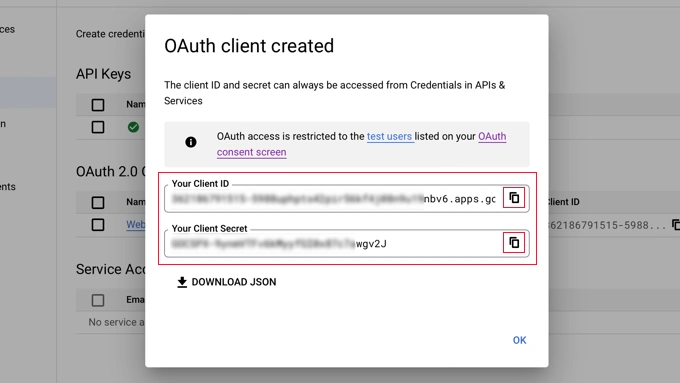 现在,您需要在 Google Cloud 浏览器选项卡上做最后一件事。您仍然应该看到带有您的客户端 ID 和客户端密码的弹出窗口。您可以通过单击弹出窗口底部的“确定”来关闭弹出窗口。
