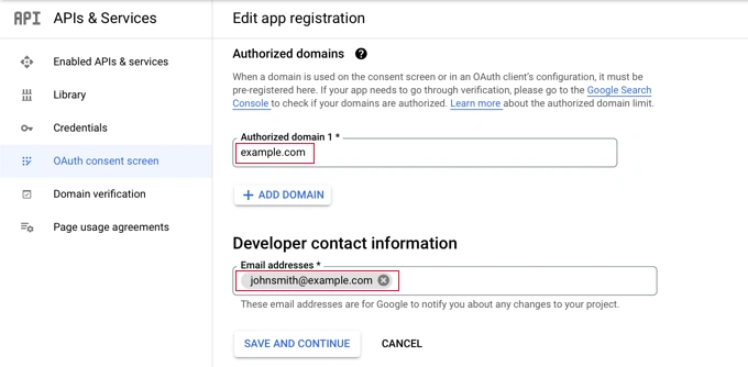 然后你需要点击“添加域” ' 按钮添加您网站的域名,例如“example.com”。如果您想将一键式 Google 登录添加到多个网站,则可以单击“+ 添加域”按钮添加另一个域。
