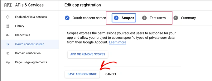 接下来,您将进入范围和测试用户页面。对于这两个页面,只需滚动到底部并单击“保存并继续”按钮即可。