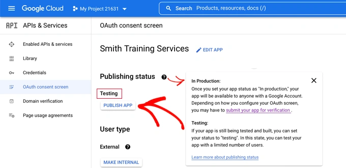 现在您需要单击左侧菜单中的“OAuth 同意屏幕”。您可以看到您的 Google 应用处于“测试”模式。这允许您使用有限数量的用户测试您的应用程序。现在您在使用插件验证设置时收到了“工作正常”通知,您可以将其移至“生产”模式。