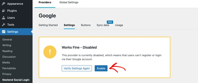 只需点击“验证设置”按钮,插件就会确保您创建的 Google 应用程序正常运行。如果您正确地执行了上述步骤,那么您应该会看到一条通知,上面写着“工作正常 - 已禁用”。