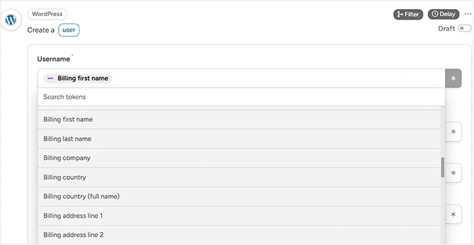 首先,点击字段旁边的星号(*)图标。这会打开一个列表,显示Automator可以从WooCommerce触发器中提取的所有可用数据。