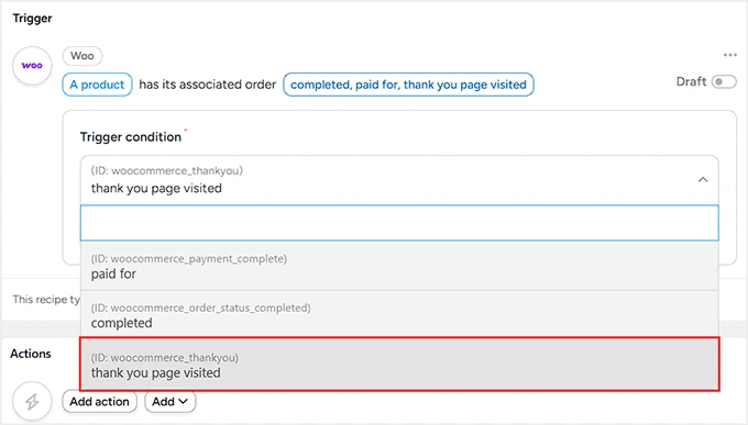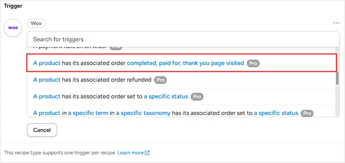 - 通过选择触发器创建配方,如 WooCommerce 购买或 WPForms 提交。